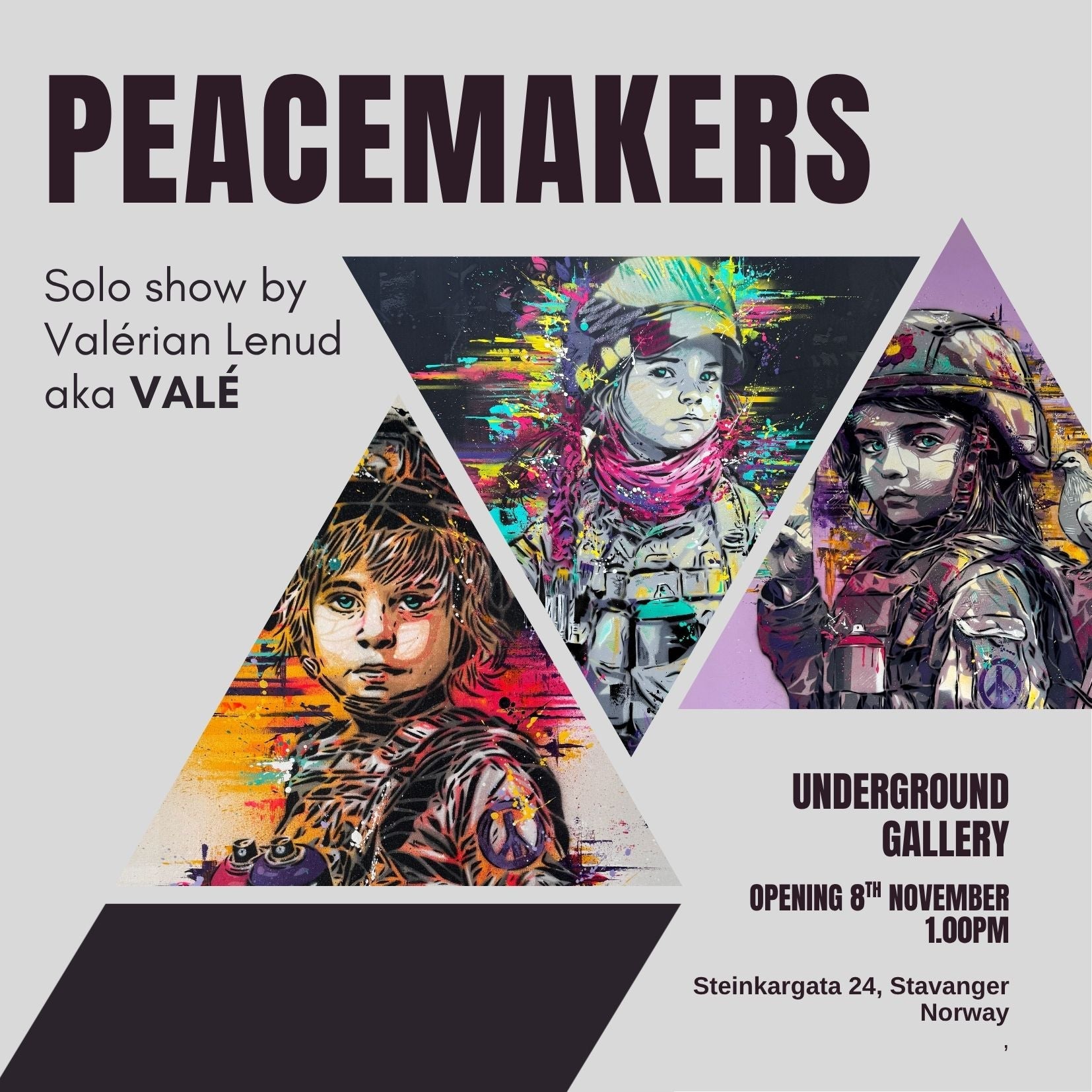 I dette nye kapittelet, presentert av Underground Gallery, viser VALÉ et kuratert utvalg av verk fra den opprinnelige Peacemakers-serien, sammen med nye portretter laget spesielt for det norske publikummet. Disse bildene – inspirert av kunstnerens dype interesse for identitet, mangfold og kulturelt minne – fremstiller barn fra ulike deler av verden som symbolske ambassadører for håp og motstandskraft.