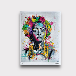 HAWA av Valérian Lenud Opplag: 20 limited edition Ferdig innrammet, svart ramme og svart passepartout.  Signert og nummerert av kunstner Hand-Finished with spray paint Str: 40 x 50 cm (15,75 x 19,7 in.) Papir: 320g watercolor paper 100% cotton +5% kunstavgift +Frakt eller hentes i galleriet etter avtale   *Verket vil bli vist frem under vernissage Peacemaker av Valérian 06 november klokken 18.00 i Fabrikkveien 36, Hedin Automotive. *Authentic certification stamp.