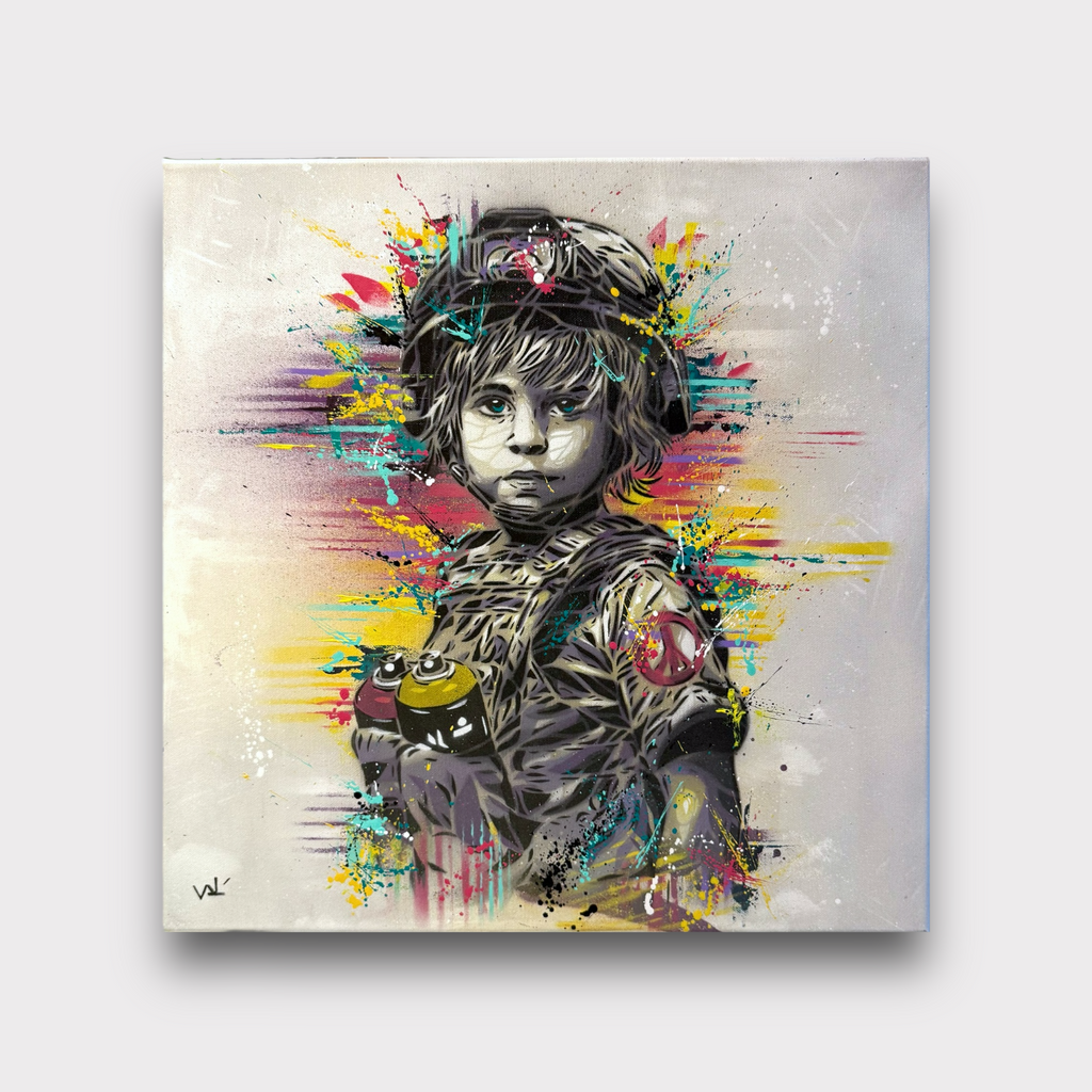 Soldier of Color I by Valérian Lenud Original på lerret Str: 50x50cm  Teknikk: Mixed media (acrylic and spray paint on canvas) +5% kunstavgift Frakt eller hentes +Frakt eller hentes etter avtale med galleriet Adresse - Galleri Underground Gallery AS  Steinkargata 24, Stavanger    Om kunstner:  VALE - Valérian Lenud “Child Soldiers of Peace” collection. The “Child Soldiers of Peace” collection is a series of works of art created by the artist Valérian. The works feature children wearing military uniforms, but instead of being armed, they wear peace symbols and painting accessories. Valérian created this series to raise awareness of the tragic consequences of war on children and to encourage peace and tolerance. The bright and cheerful colors of the works contrast with the military context, which recalls the innocence of children and their natural desire for peace. Painted with spray paint, acrylic and oil pastel on canvas.
